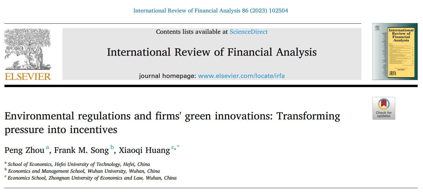 2023年3月,我院教师黄晓琪博士为通讯作者的合作论文《Environmental regulations and firms' green innovations: Transforming pressure into incentives》在期刊《International Review of Financial Analysis》第86卷正式刊出。