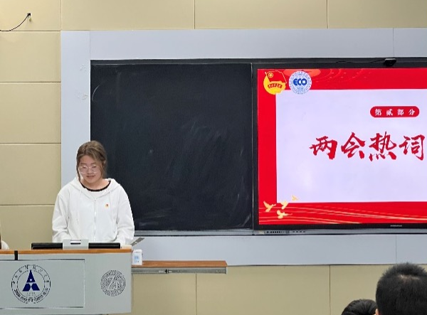 立足两会,关注热点。青马班学员张至柔同学向同学们分享了有关两会的五个热点词语,以此加深同学们对两会的关注和理解,激发起同学们的思考的兴趣,进一步加强两会精神的学习。