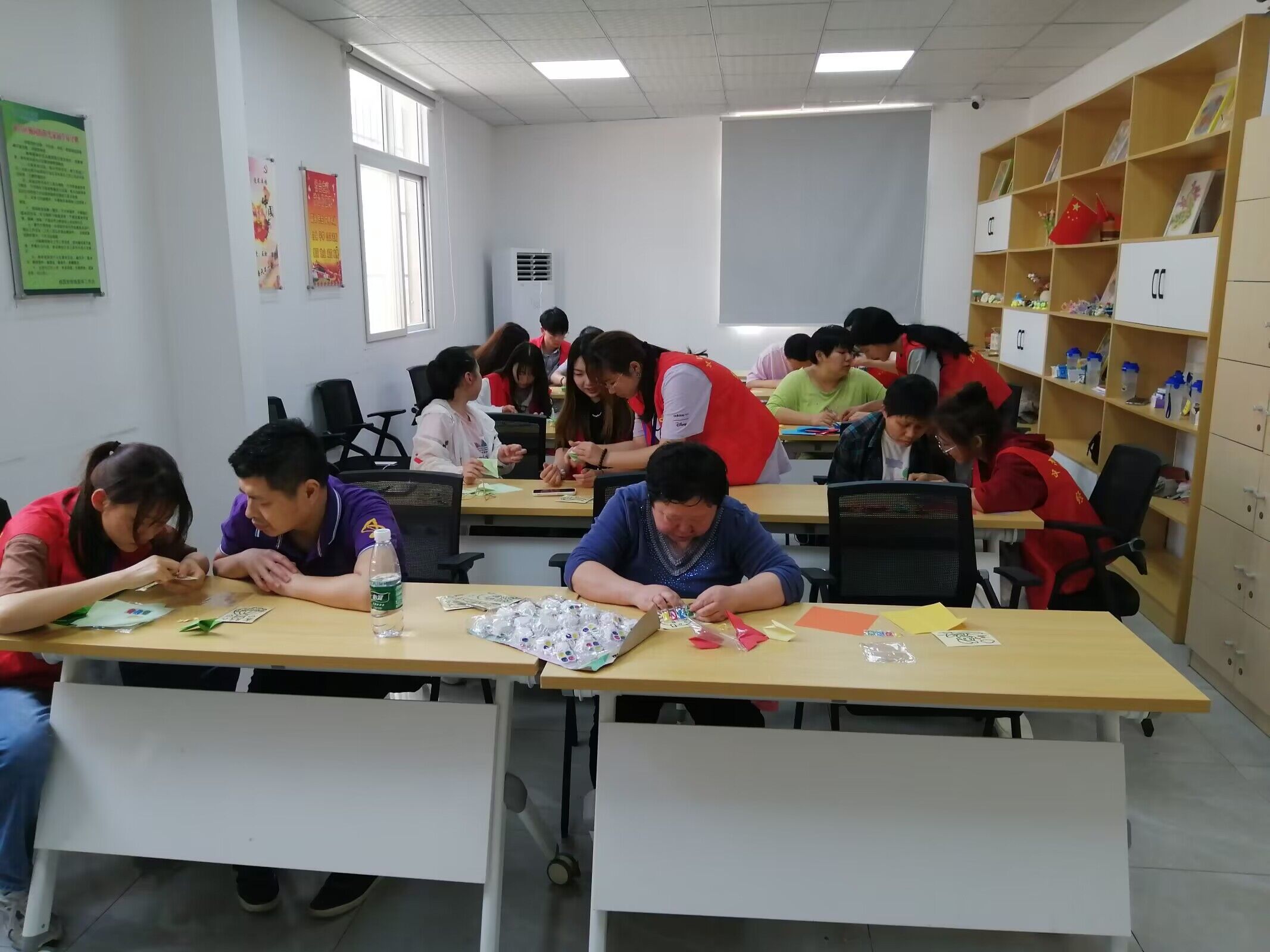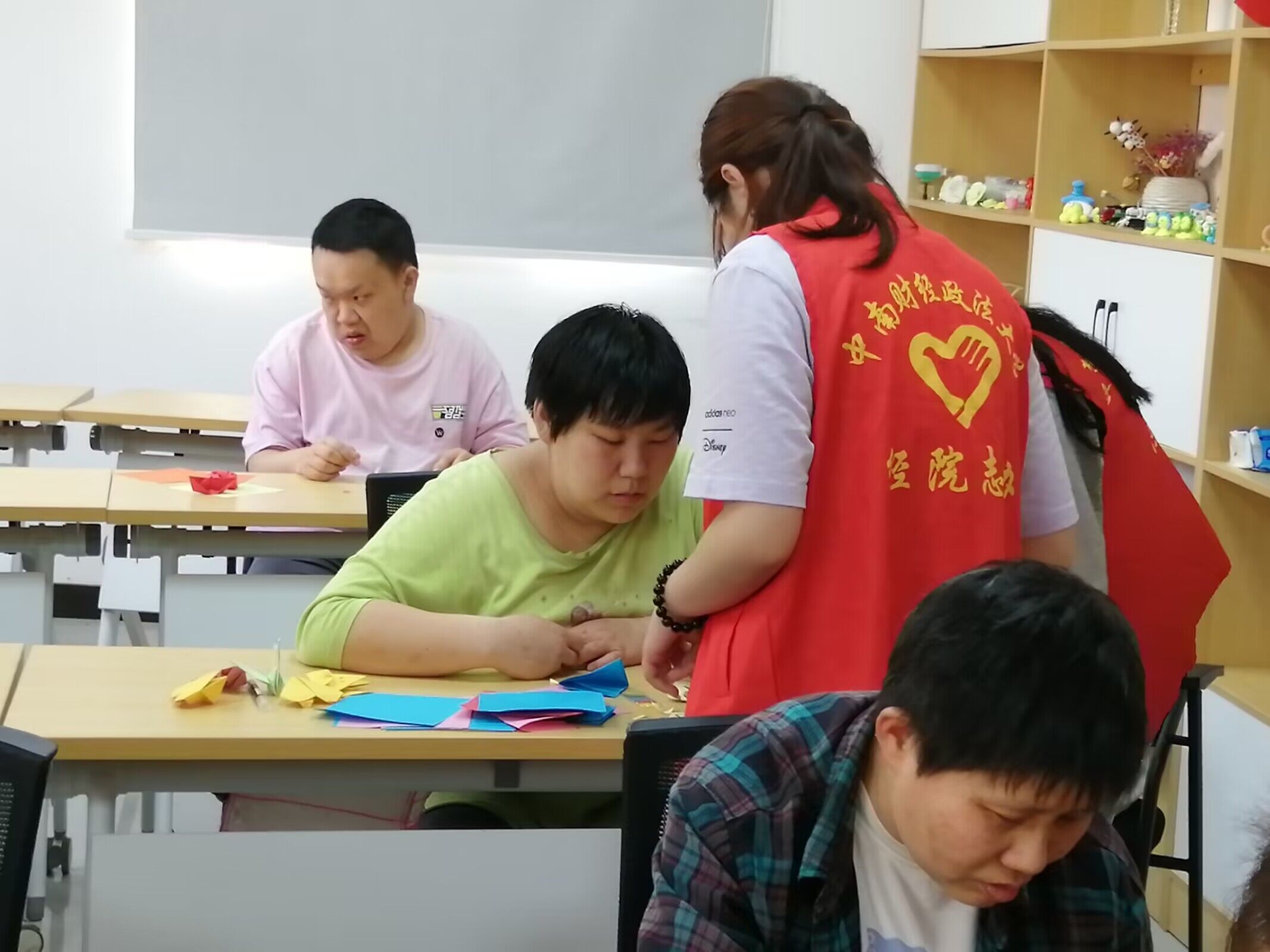活动当天,经院志协的志愿者们早早到达杨园街阳光家园,与阳光家园负责人进行最后的活动确认和事项交流后,有条不紊地开展准备工作。活动开始前,在热烈的欢迎声中,志愿者与大朋友们组成搭档。活动正式开始,志愿者给每位大朋友分发彩色折纸,并播放提前准备好的简易折纸视频,志愿者们手把手带着大朋友们折出蝴蝶、千纸鹤、爱心、帆船、百合花等各式各样的造型,耐心地陪伴他们完成沙画填色卡片,与他们一同发挥想象力,搭配彩色沙粒。随后,志愿者们给每一位大朋友分发石膏娃娃,为他们准备好颜料和画笔,鼓励他们尽情挥洒色彩。完成石膏娃娃的大朋友还可以与志愿者一同用扭扭棒做出花朵、小青蛙、蝴蝶等各式各样的手工图案。大朋友们每完成一个作品,都会很兴奋地向志愿者们道谢并与周围的人分享。在最后的注意力训练活动中,志愿者们通过给出水果的名称,让大朋友们根据关键词做出相应的动作,锻炼了他们的注意力和反应速度。大朋友们画出的每一幅画,做出的每一个手工作品,也让志愿者们倍受鼓舞,更添干劲......在教室里交织不断的欢笑声与喝彩声中,活动落下帷幕。