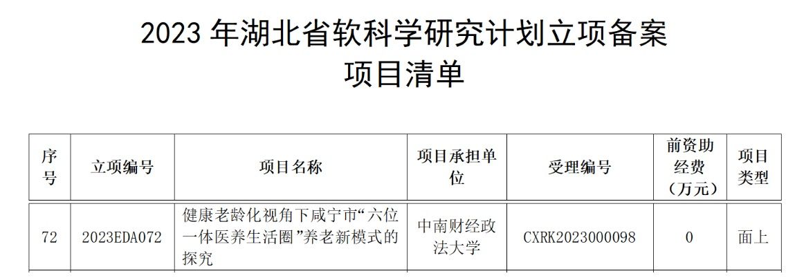 近日,湖北省科技厅公布2023年湖北省软科学研究计划立项备案项目,我院潘峣老师的项目《健康老龄化视角下咸宁市“六位一体医养生活圈”养老新模式的探究》入选面上项目清单。