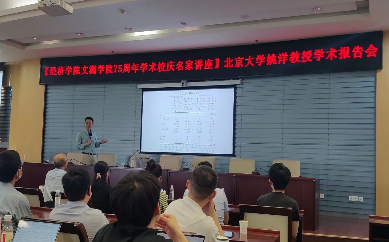 2023年5月18日15:00-16:30,【经济学院文澜学院75周年学术校庆名家讲座】经济中南“文澜高端论坛系列活动”第29期姚洋教授学术讲座在中原楼七楼会议室成功举办。本期学术讲座由半岛线上平台、文澜学院承办。著名经济学家、北京大学国家发展研究院院长、《经济学(季刊)》主编、中国经济学年会理事长姚洋教授应邀参加,其分享的学术主题为“中央苏区妇女解放运动对女性地位的长期影响”。本次论坛由经济学院院长李小平教授主持,经济学院、文澜学院等多名专任教师,以及130余名研究生参加,论坛现场座无虚席。