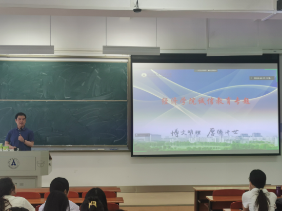 五月,经济学院2019级本科生在南附楼203开展了诚信教育主题活动,由院党委副书记俞凡主讲。俞凡从社会主义核心价值观入题,指出诚信是公民道德的基石,既是做人做事的道德底线,也是社会运行的基本条件。现代社会不仅是物质丰裕的社会,也应是诚信有序的社会;市场经济不仅是法治经济,也应是信用经济。“人而无信,不知其可也”。失去诚信,个人就会失去立身之本,社会就失去运行之轨。诚信是中华民族的传统美德,是全人类所认同的道德规范,诚信对于维护社会稳定提升社会的经济发展等方面都具有重大的意义。
