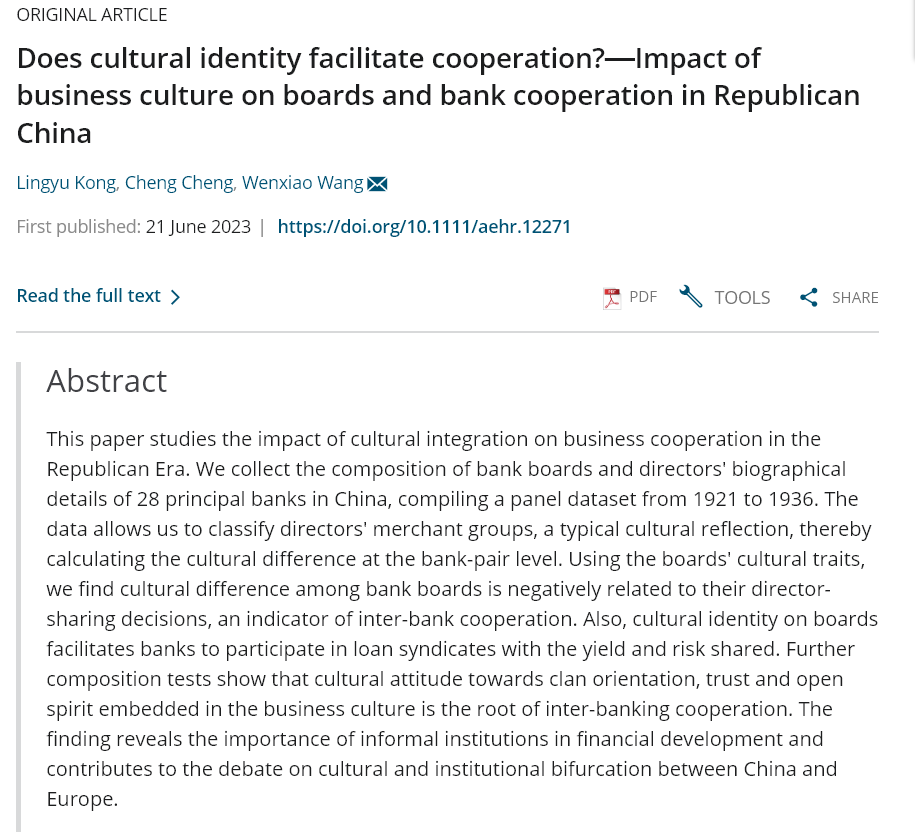 2023年6月,我院孔令宇副教授为第一作者的论文“Does cultural identity facilitate cooperation?—Impact of business culture on boards and bank cooperation in Republican China”,在SSCI刊物《Asia-Pacific Economic History Review》上发表。