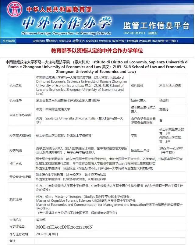 1.名校合作,联合培养。本项目由中南财经政法大学和罗马第一大学联合举办。罗马第一大学在法学、经济学、医学、人工智能等领域的研究长期处于世界一流水平。经济学学科排名一直处于全意顶尖水平,培养了包括意大利现任总统在内的多位著名政治家、法官以及一批以诺贝尔经济学奖得主弗兰科·莫迪利安尼(Franco Modigliani)为代表的经济学家。中南财经政法大学法学学科两度进入“双一流”建设名单,经济学专业是国家级一流专业,理论经济学是中南地区实力最强、规模最大的理论经济学学科,经济学院也是中南地区最早获得理论经济学一级学科点的学院,且被教育部批准成为“经济学复合型人才培养模式创新实验区”,经济学院院长李小平教授现为第一届全国数字经济专业学位研究生教育指导委员会委员。