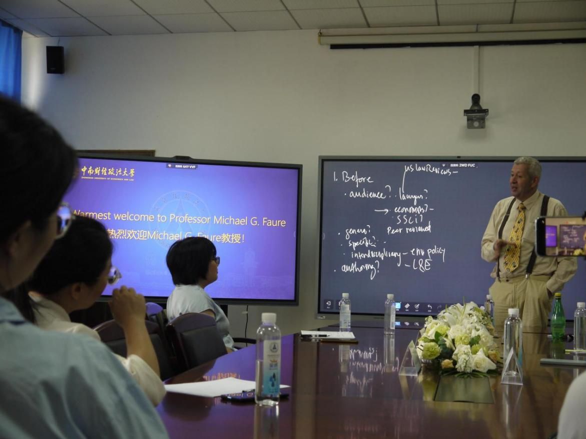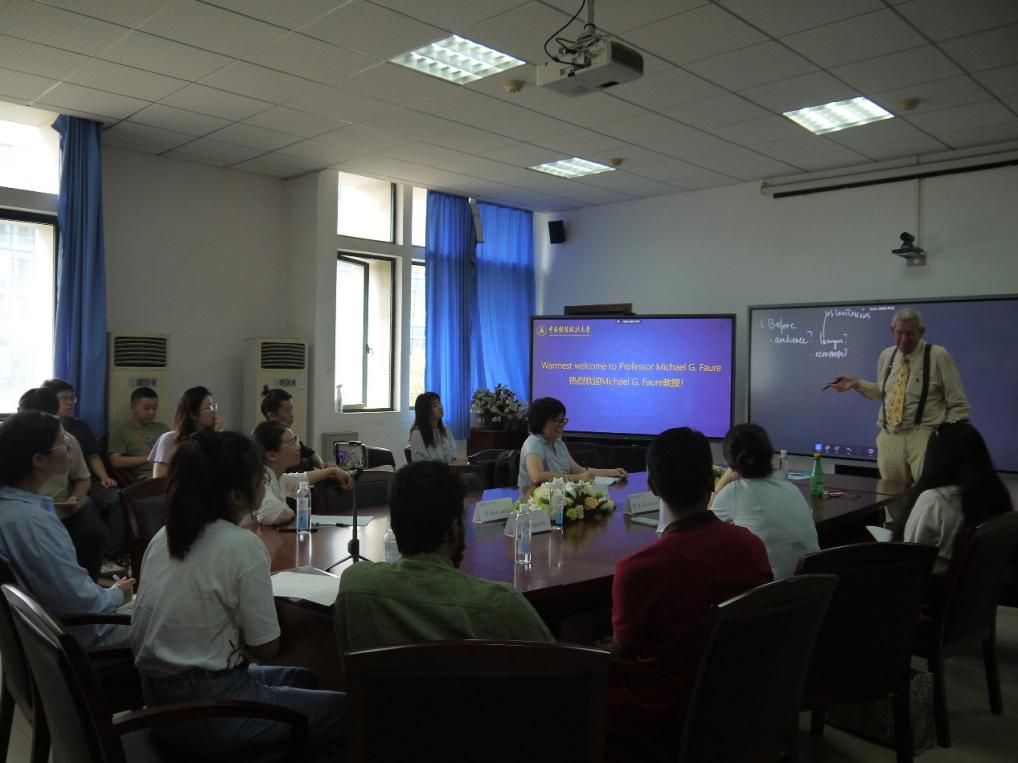 授聘仪式结束后,Faure教授应邀,在8月29日、30日上午以“环境与气候变化法的经济分析”为主题举办了两场讲座。讲座由中南财经政法大学全球气候法经济学研究中心主任、经济学院曾盈盈副教授主持。Faure教授就环境法和气候变化法的经济学基础与分析、中欧气候合作以及跨学科研究、英语学术论文的撰写与期刊发表等做了精彩的分享。