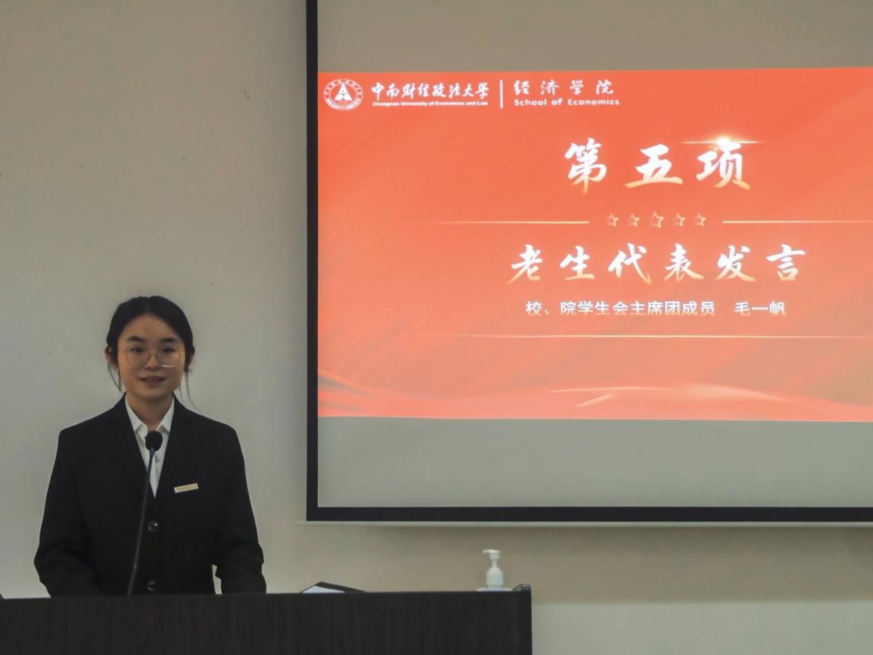 学生代表发言环节中,老生代表毛一帆结合自己的学习经验和求学之路进行分享,并针对自己的学习成果和心路历程发表感悟,极大鼓舞了与会新生。新生代表徐磐睿在发言中表示,经济学院是他追求梦想的舞台,他将努力学习,不辜负学院的殷切期望。
