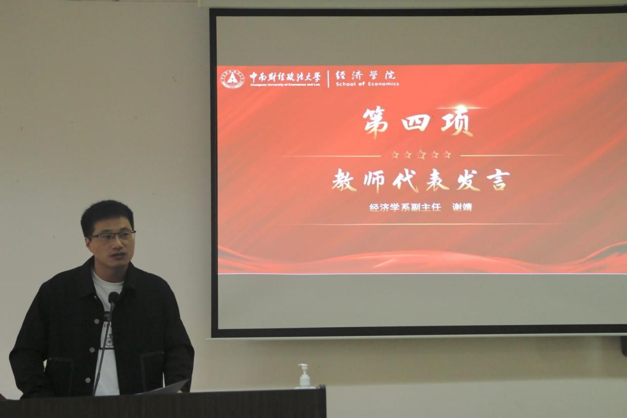 教师代表谢靖副教授向同学们提出“经济学是致用之学”,鼓励新生们关注社会经济的现实运行,培养批判性和创造性思维,提高自己的学术素养和综合能力。