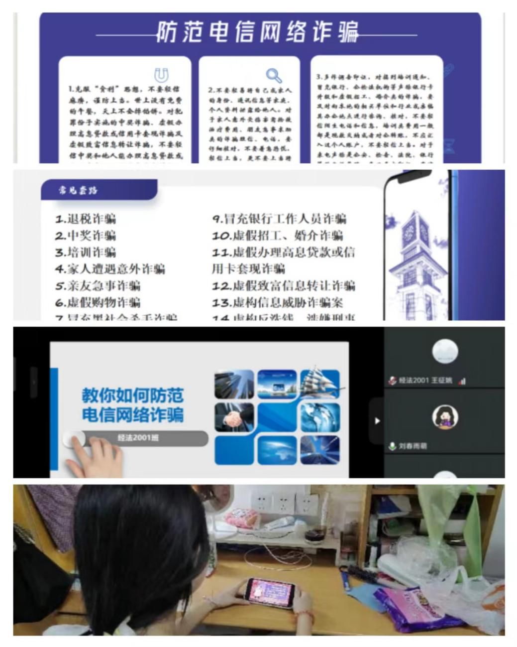 2020级本科生以主题班会为契机,为同学们普及了冒充公检法、领导、熟人类诈骗;代办信用卡、贷款类诈骗等诈骗骗术,并做出保护个人隐私、对“自报家门”的陌生人保持警惕、网贷需谨慎的防骗提示,帮助同学们辨别并预防非法校园贷及网络诈骗。2020级焦畅同学表示,此次班会提升了防诈骗意识和能力,在未来的学习生活中将努力提高反诈意识,遵守学校规章制度,保证自身的人身和财产安全。