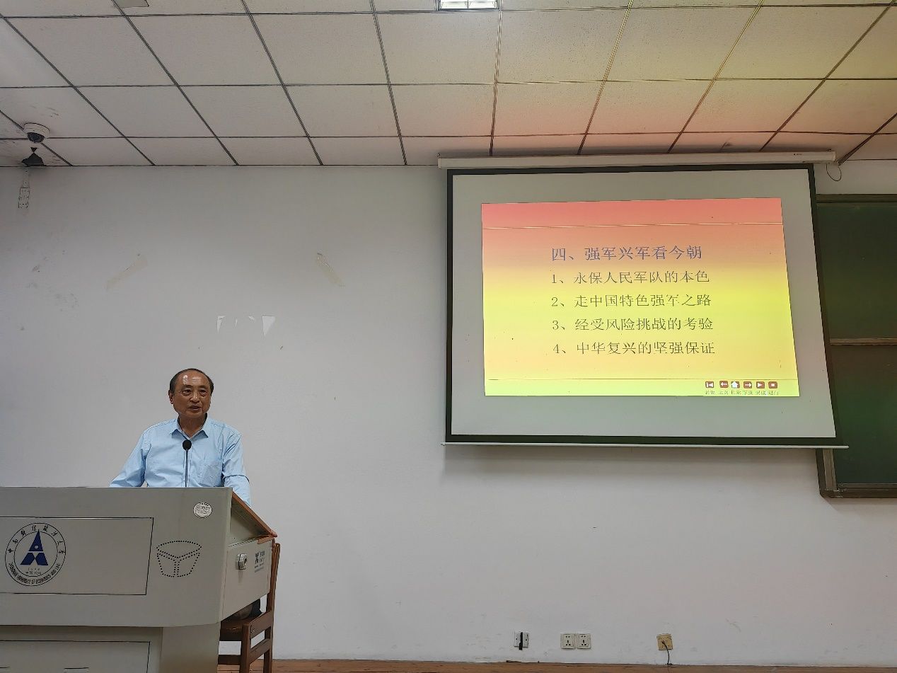 在“强军兴军在今朝”部分,胡江滨教授向全员同学解释了习近平总书记对于建设新时代的人民军队的要求——建设一支听党指挥、能打胜仗、作风优良的文明之师、正义之师、威武之师。胡教授指出,在佩洛西窜访台湾后我国人民解放军环台湾岛演习,这表明我国的人民军队正在日益强大,是我国国家安全的坚实屏障。