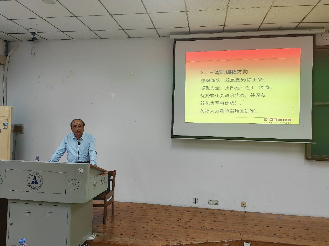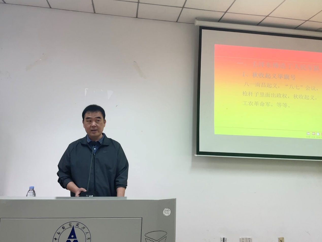 在“毛泽东同志缔造了人民军队”部分,胡江滨教授讲解了从南昌起义到八七会议到秋收起义再到三湾改编的历史,讲述了毛主席建立人民军队的过程,阐述了三湾改编中的一系列举措对人民军队改造基因、凝聚力量以及将政治优势转化为军事优势等方面延续至今的巨大作用。而后,通过与旧军队作对比,胡江滨教授进一步突出了毛主席缔造的人民军队在战斗能力、纪律要求、精神风貌等方面的巨大不同。