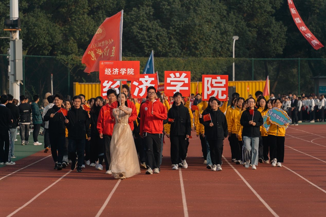 上午8时20分,我校国旗护卫队迈着铿锵有力的步伐,手举耀眼夺目的五星红旗入场,拉开了校运会的序幕。经济学院代表队伴随音乐自信入场,他们精神抖擞、神采飞扬,充分展现了朝气蓬勃的青春活力和昂扬向上的精神风貌。