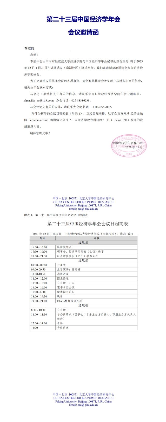 第二十三届中国经济学年会会议邀请函
