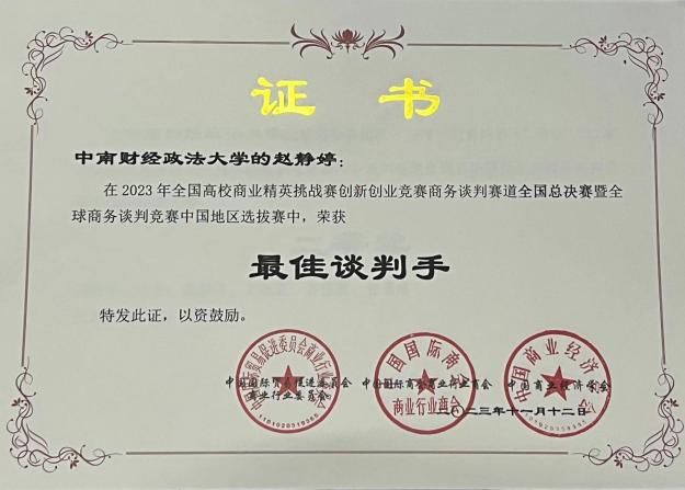 11月12日,2023年全国高校商业精英挑战赛商务谈判总决赛暨全球商务谈判竞赛中国地区选拔赛圆满落幕。本次商务谈判竞赛是中国国际贸易促进委员会商业行业委员会主办的面向在校大学生的综合性商科类竞赛。今年共有来自全国各地200余所高等院校的800余支团队报名参赛。我院国际商务专业的同学组成的“三粤一新勇闯鄂A”团队荣获中国地区二等奖,赵静婷同学获得全国总决赛“最佳谈判手”的称号。