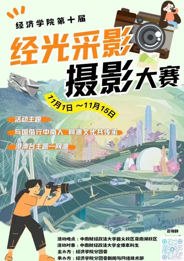 学生记者 胡漪)为了丰富在校学生的课余生活,缓解学业压力,同时培养同学们对摄影的兴趣,为广大摄影爱好者提供一个交流平台,经济学院特此举办第十届“经光影”摄影大赛。本次活动以“七五芳华中南大 与国偕行中南人”为主题,共设“港澳台——同源”“七五有我”“盛世有我”“青春有我”四个赛道,面向中南财经政法大学全体本科生开展。