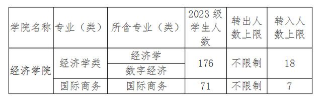 学院不限制各专业(类)学生的转出人数,有意愿转出并符合报名条件的学生均可向学院提出调整修读专业(类)申请。调入名额为2023级各专业在册人数的10%,各专业类具体名额如下,各专业类名额不互通使用。全校的转入名额见(附件1)。
