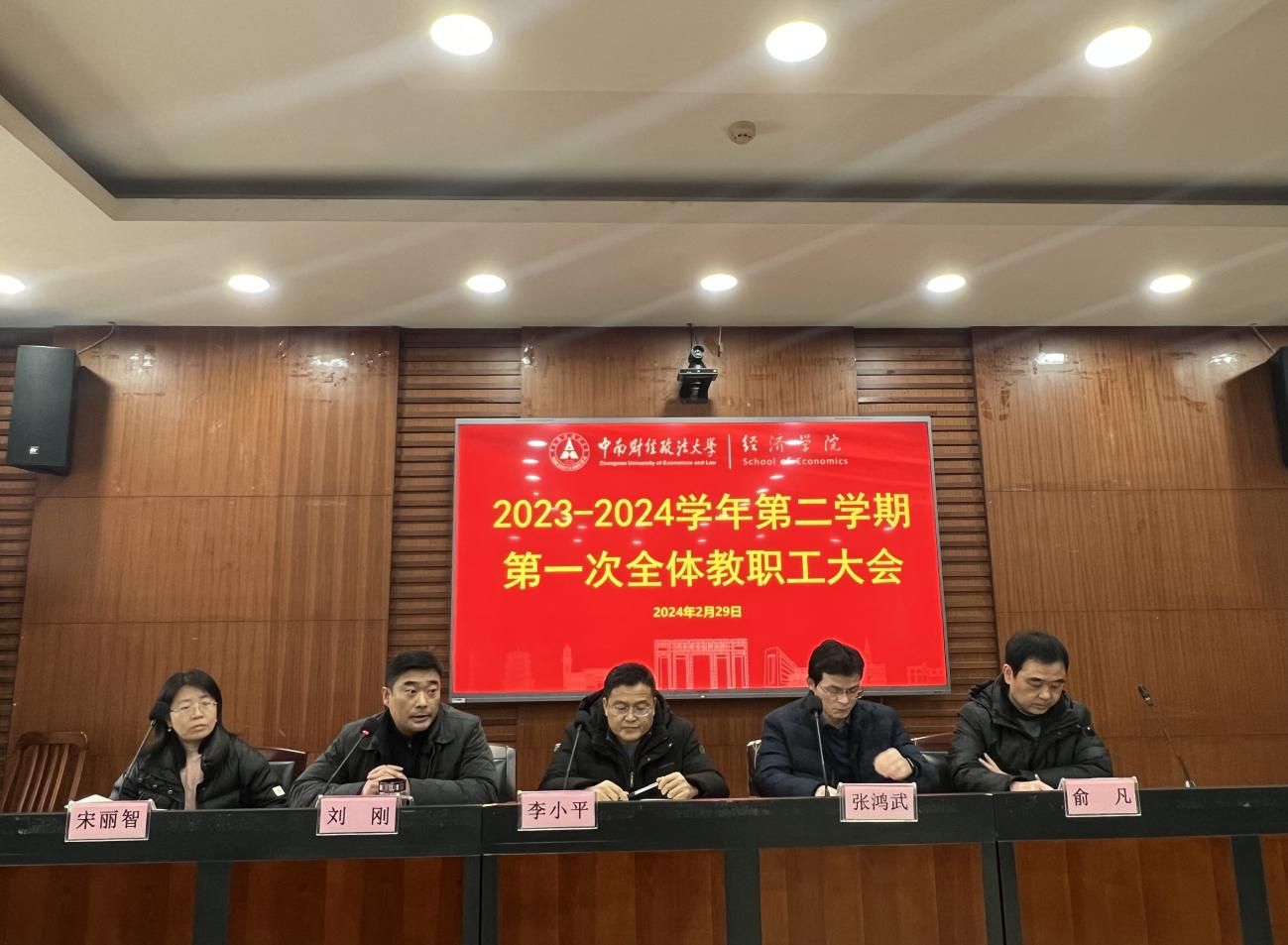 2024年2月26日下午,经济学院在文泉楼南206会议室召开2023—2024学年第二学期第一次全体教职工大会。经济学院院长李小平,党委书记刘刚,副院长张鸿武、宋丽智,党委副书记俞凡及学院全体教职工出席会议。大会由刘刚主持。