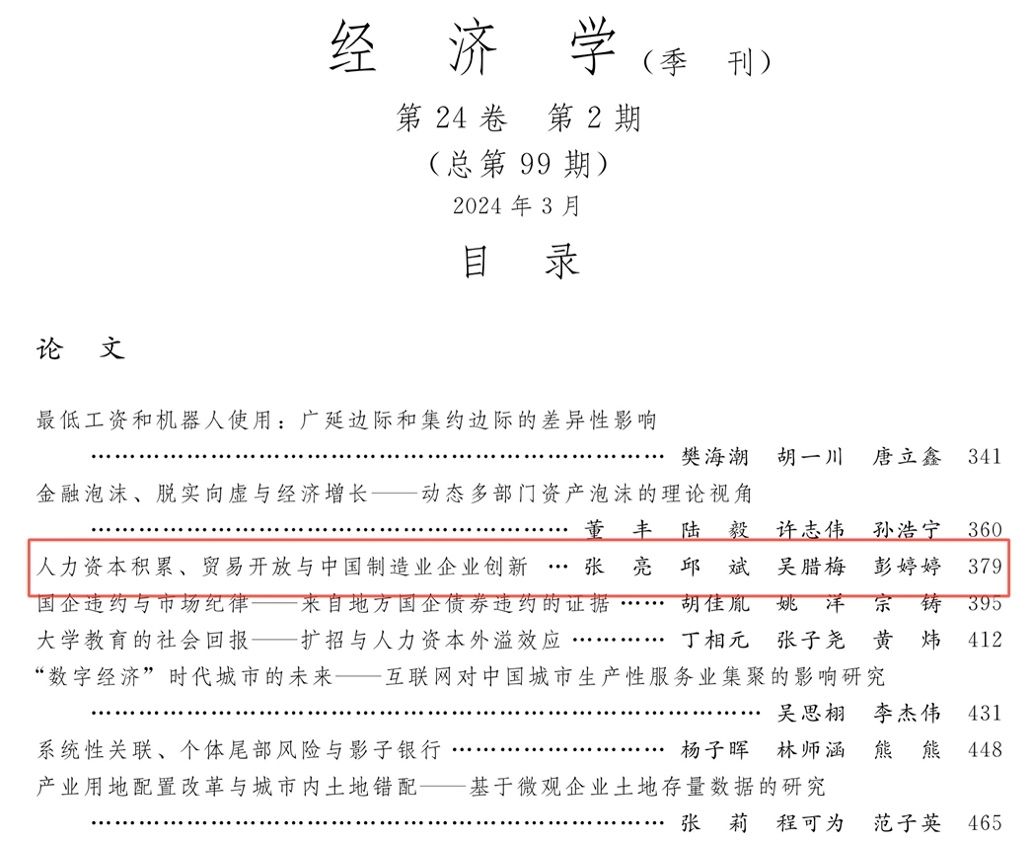 近日,经济学院张亮老师合作论文《人力资本积累、贸易开放与中国制造业企业创新》在《经济学》(季刊)2024年第2期刊出。