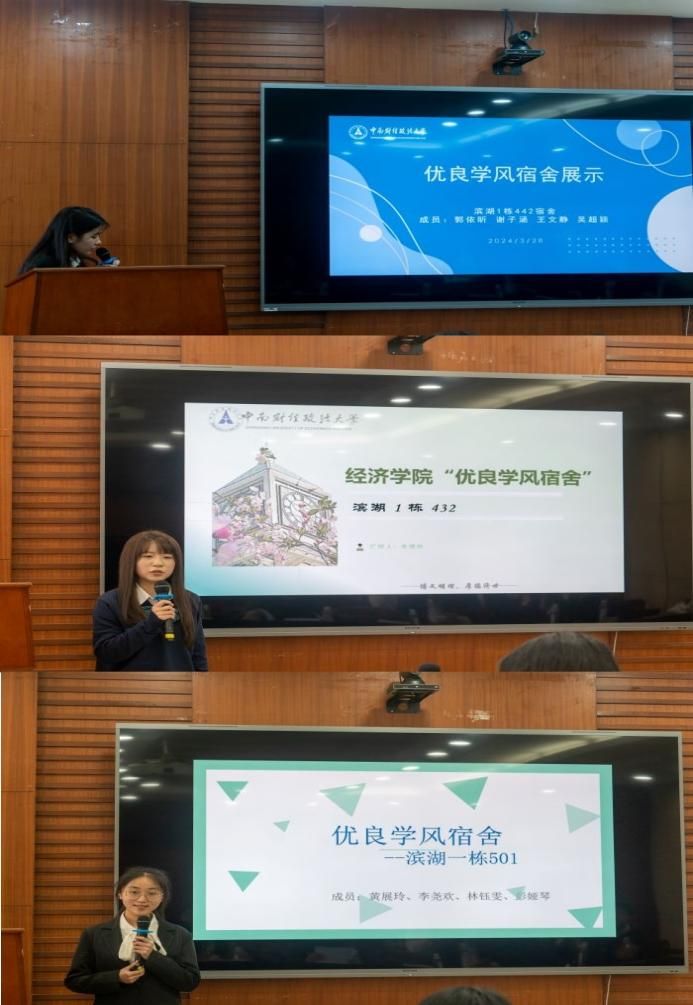 最后,“优良学风宿舍”进行答辩。滨湖1栋442、滨湖1栋432、滨湖1栋501的三位寝室长从学习成果、日常生活和室风营造三方面阐述了各寝室在学风建设方面的成果,他们一心向学的良好学风和独特的寝室文化引起了在场同学们的阵阵惊叹。