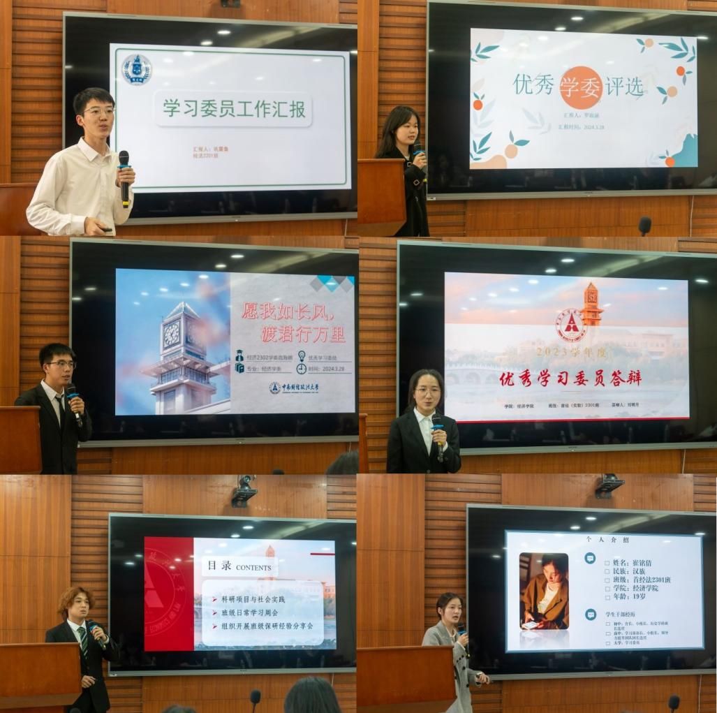 紧接着是“优秀学习委员”进行答辩。其中,经法2201班学习委员巩震鲁回顾了自己一年来的“学委生活”,他以幽默风趣的语言介绍了自己独特的工作思想以及担任学委以来带领班级所取得的优异成绩。经济2303班学习委员罗淑涵从思想道德、学习能力、本职工作三个方面分享了自己担任学委半年来的心得与成果。经济2302班学习委员高海祺则从个人经历、日常工作、总结反思三方面介绍自己的工作,并以生动的语言表达了自己对于学习委员一职的热爱。