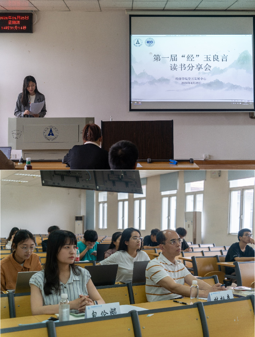 (学生记者 刘怡彤 何胤良 摄影 何胤良)为激发学生阅读兴趣,倡导师生共同探讨书中智慧,进一步推动学校学风建设工作,助力打造书香校园,2024年4月25日下午,经济学院学习发展中心于首义校区文润303顺利举办第一届 “经”玉良言读书分享会,邀请同学们共读一本书,各抒不同思。本次活动邀请了半岛线上平台硕士生导师林相森副教授担任主讲老师,经济学院2023级本科生辅导员包伦娜老师出席活动,中南财经政法大学各学院学生代表到场观看。