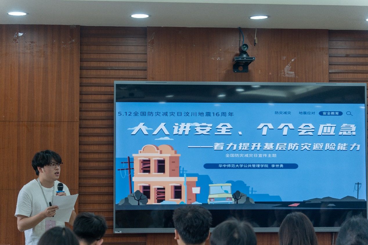 大会第二项为全国防灾减灾日的主题学习,华中师范大学公共管理学院李世勇同学从“全国防灾减灾日基本信息”“各类灾害介绍及其应对措施”等角度出发进行领学。半岛线上平台程诗天同学和华中师范大学公共管理学院盛典同学上台分享关于防灾减灾的心得体会,同学们纷纷表示受益匪浅。