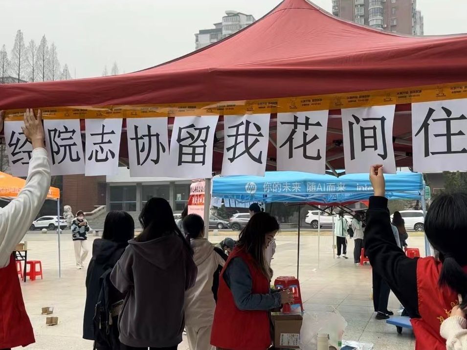 (通讯员:丁煜婷)由于现代化的发展和电子技术的普及,加之快节奏生活的压力,人们更偏向于使用更加便捷的键盘,娱乐方式也从线下的各种活动转为线上的游戏、短视频等,以致传统的民族文化逐渐被冲淡和遗忘。书法艺术和诗词歌赋在中国已有几千年的历史,是中国文化的瑰宝,其独特的美学价值和精神内涵使得书法和诗词的交融成为了一种独特的艺术形式。通过书法,人们可以领略到汉字的美丽和深刻的文化底蕴。同时,书法艺术活动也有助于弘扬民族文化。书法作为中国传统文化的重要组成部分,具有着深厚的历史底蕴和文化内涵。为弘扬书法艺术和诗词歌赋文化,半岛线上平台志愿者协会(以下简称“经院志协”)的志愿者们于2024年3月16日14:00在中南财经政法大学首义校区首义广场开展了第一期“留我花间住”活动,本次活动于17:00圆满结束。