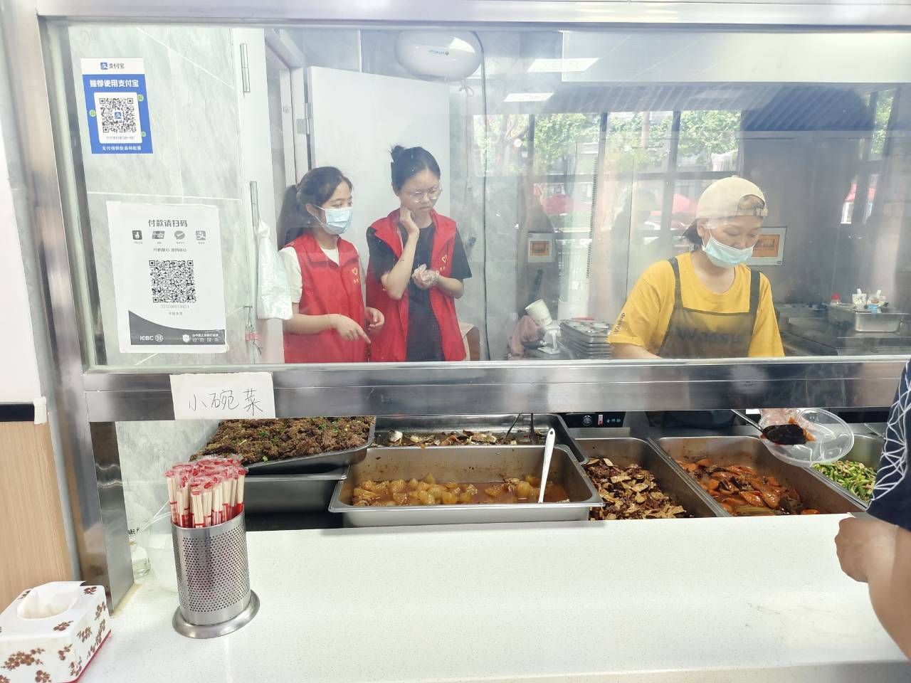 活动伊始,志愿者们于上午1000集合会面,共同前往武汉市东西湖常青花园社区。到达目的地后,志愿者们兵分三路,一路带上反诈传单,在社区内部宣讲反诈小知识;一路前往幸福食堂后厨跟师傅们学习打菜的学问;最后一路向食堂阿姨们学习如何清理餐桌等收尾工作。志愿服务步步落实到位,具体而微。