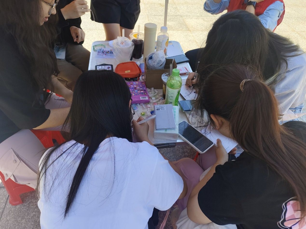 活动尾声将近,志愿者们开始了最后一个活动——心语串珠。一颗颗晶莹剔透的珠子,在阳光的照耀下折射暖光。成员们小心翼翼地穿着珠子,围坐在小桌旁,一串接着一串,留下满载心意礼物……