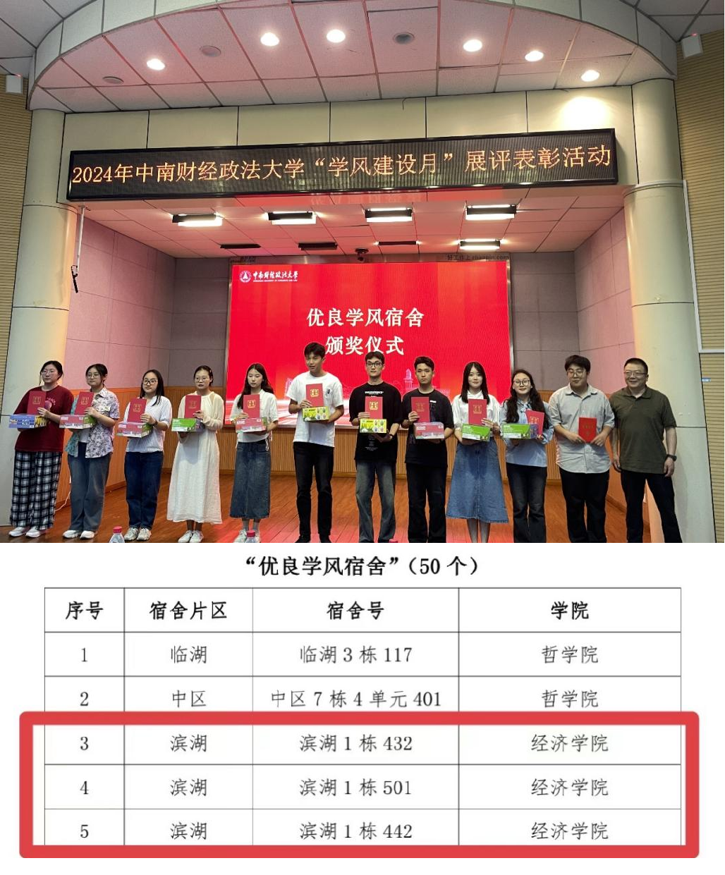 本次“学风建设月”展评表彰活动中,经济学院涌现出一批学风建设先进集体和先进个人。在集体奖项中,我院滨湖1栋432、滨湖1栋501、滨湖1栋442宿舍团结友爱、勇于奋斗,充分发扬朋辈互助精神,荣膺“优良学风宿舍”的荣誉。他们通过建立“寝室公约”等方式,督促宿舍成员作息规律,加强宿舍管理,宿舍成员之间相处融洽,互帮互助,共同进步,营造积极向上、务实奋进的学习氛围。他们刻苦学习,勇于探索,积极实践,努力掌握现代科学文化知识和专业技能,充分展现了中南大宿舍的优良学风。