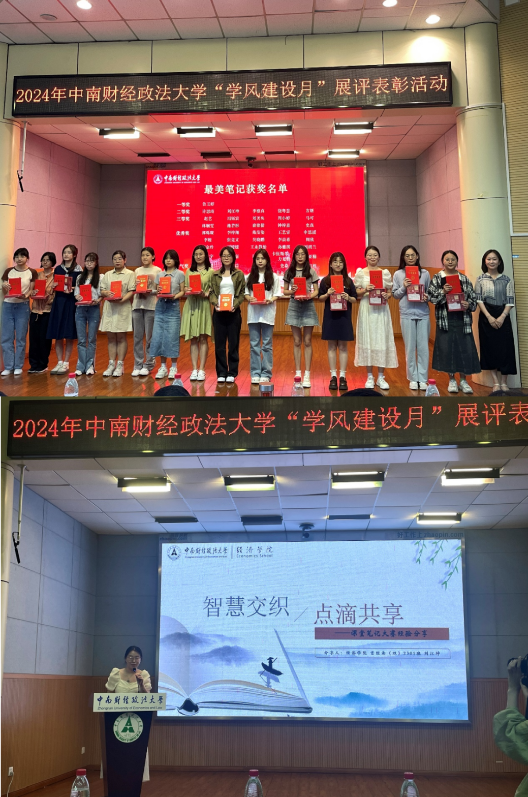 在学风建设成果方面,我院学生积极参与“优秀的你,有‘记’可循”笔记大赛,刘江坤同学荣获二等奖,崔铭倩、钟梓嘉同学荣获三等奖,王艺霏、王永静怡同学荣获优秀奖,王永静怡同学荣获人气奖。其中来自经法(双)2301班的刘江坤同学作为获奖选手代表,在颁奖典礼现场进行了“最美笔记”风采展示。优秀的笔记展现他们良好的学习习惯,体现他们踏实严谨的学习态度。