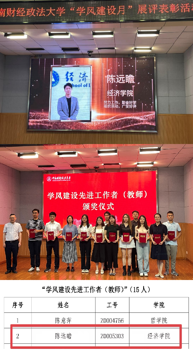 个人奖项中,我院团委书记陈远瞻老师荣膺“学风建设先进工作者(教师)”称号。陈远瞻老师作为经济学院团委书记、心理站站长、2021级本科生辅导员,始终以高度的责任感和敬业精神,默默耕耘在学生工作的最前沿,他以饱满的热情、扎实的作风,带领全院师生砥砺前行,不断为高等教育事业书写更加辉煌的篇章。
