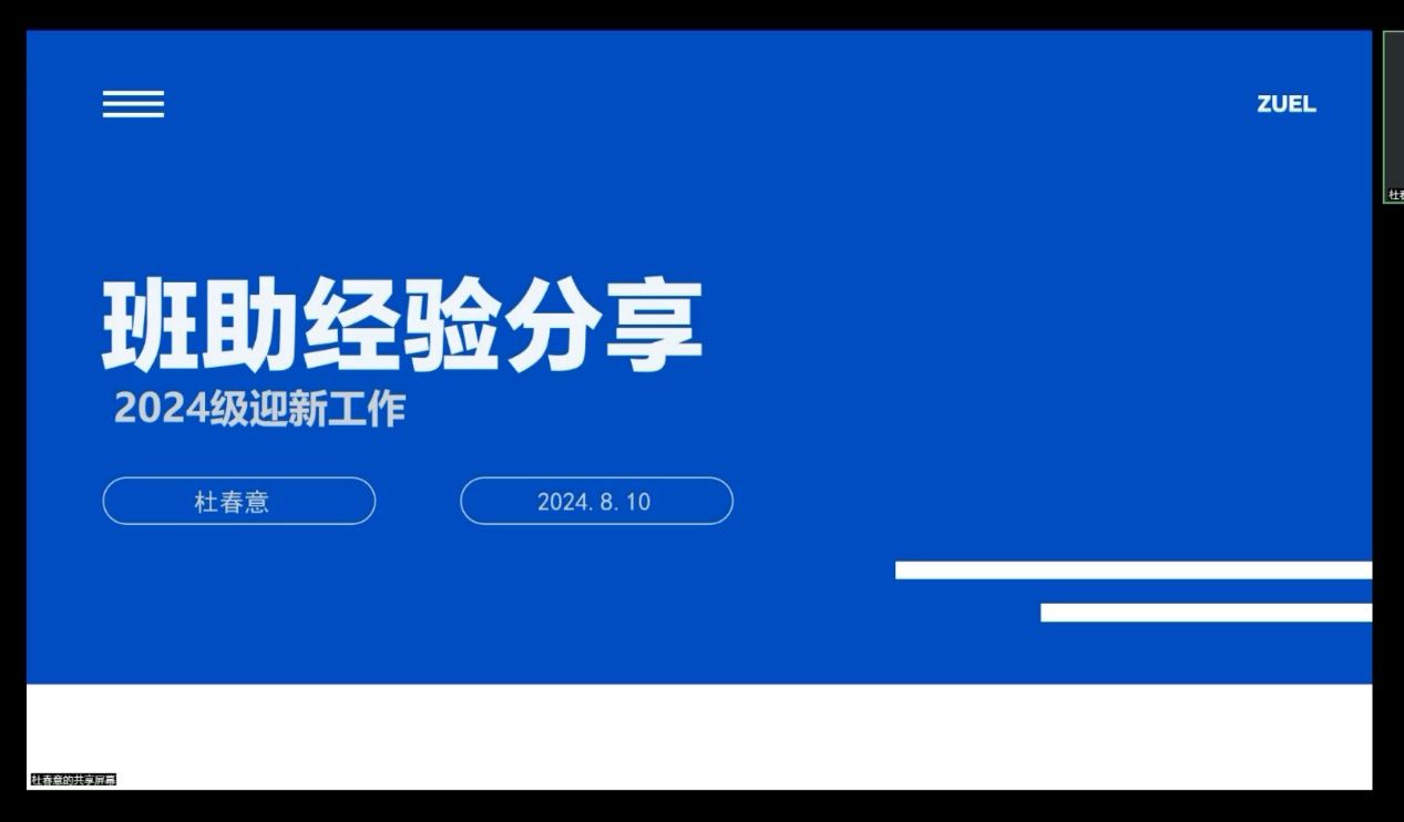 (通讯员 许怡馨)为切实推动新生辅导员助理明确工作职责、提升综合素质能力,确保新生入学各项工作顺利开展,引导新生尽快适应大学生活,8月10日晚8点,经济学院于线上开展了2024级新生辅导员助理培训会。2024级本科生辅导员沈鹏飞出席会议,2023级新生辅导员助理杜春意和2024级各新生辅导员助理线上参与。会议由沈鹏飞主持。