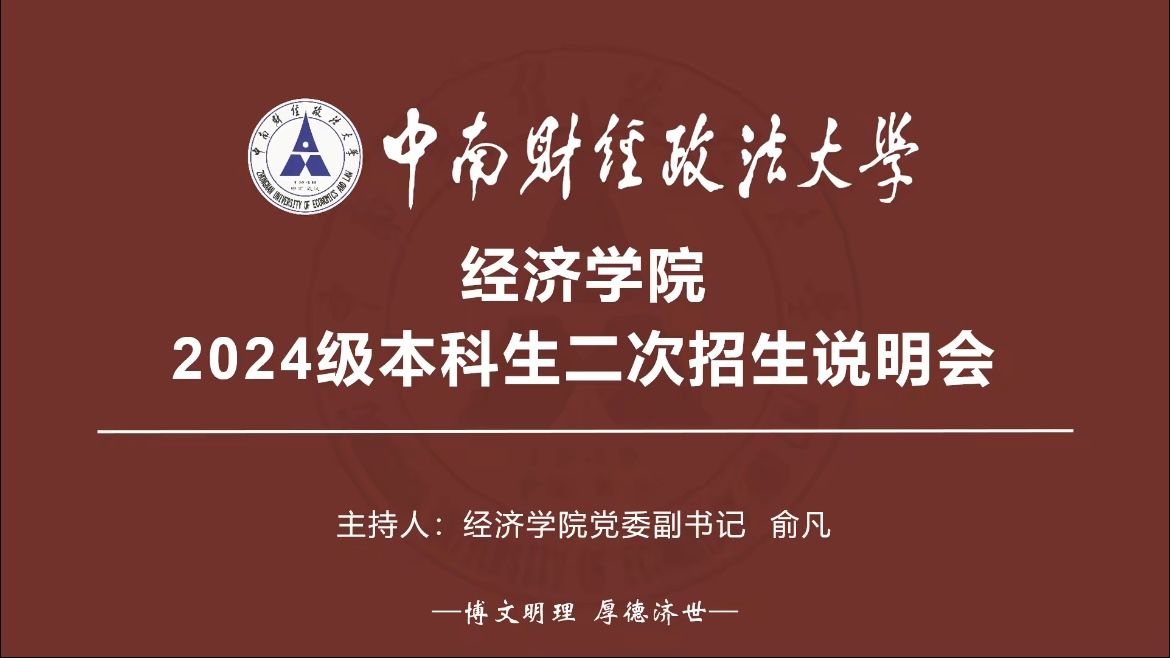 (通讯员 陈佳怡 彭熙)为帮助广大新生及家长了解学院特色专业、明确学习方向,8月31日晚19:00,经济学院于线上开展了2024级本科生二次招生说明会,经济学院院长石智雷教授、法与经济学院副院长黄赛男副教授、经济学院党委副书记俞凡、经济学系副主任谢靖副教授以及2024级本科生辅导员孟庆红、沈鹏飞出席会议,经济学院2024级全体新生及家长线上参与。会议由俞凡主持。
