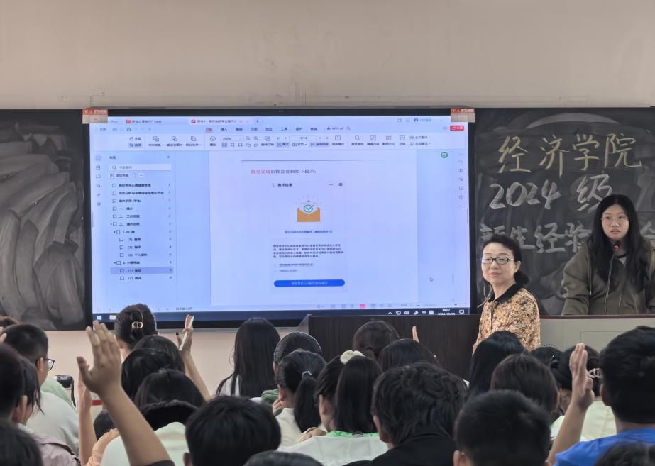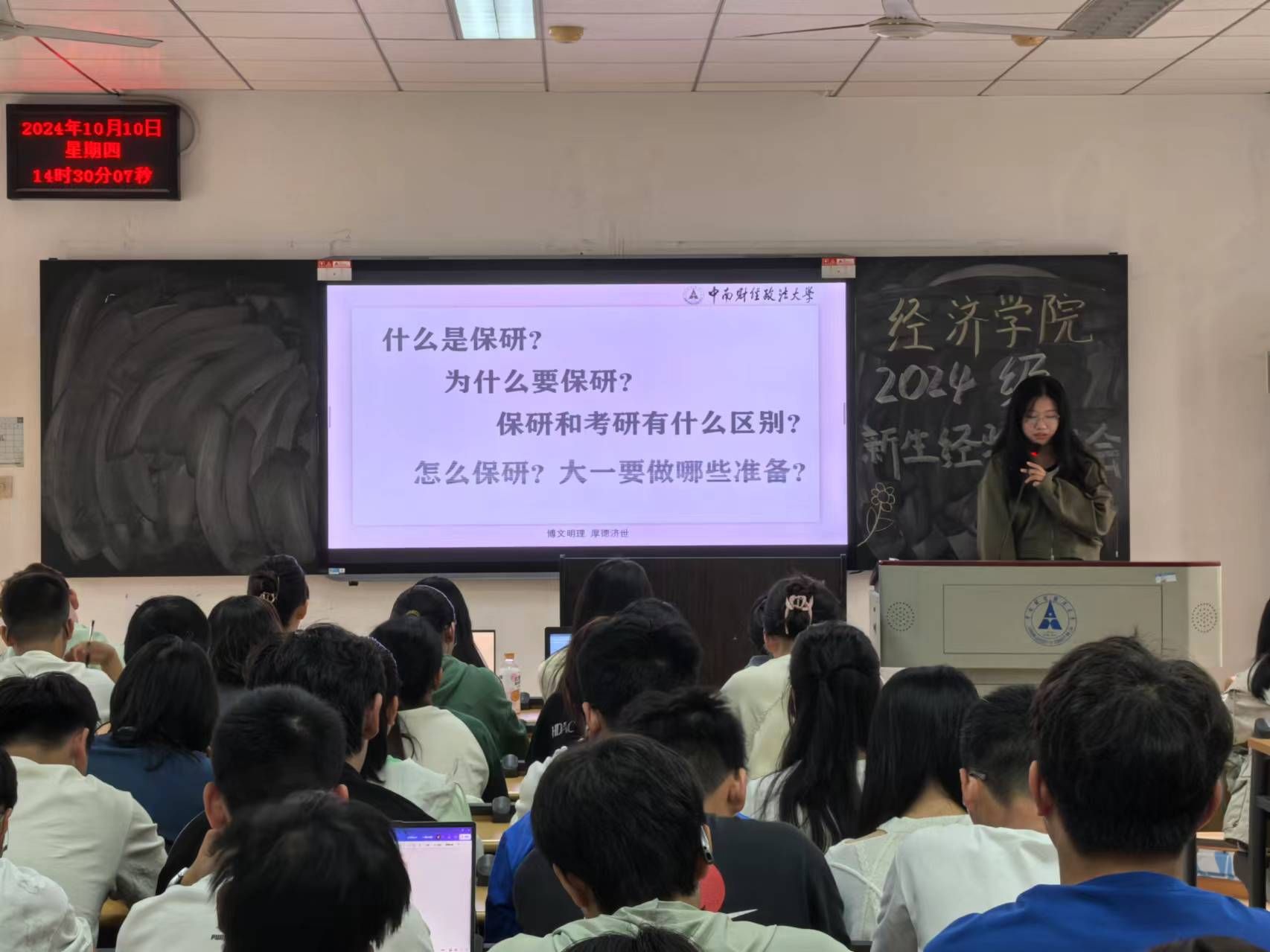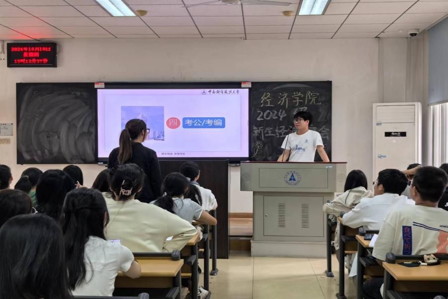 为帮助2024级新生尽快适应大学生活,明确奋斗目标,2024年10月10日下午14时,经济学院2024级新生经验分享会在文润楼201室顺利开展。本次经验分享会由来自经实、经法、国商班的优秀师兄师姐分别从留学、保研、考研、考公、就业等五个方向进行分享。辅导员孟庆红老师携经济学院2024级国商一至三班及经法经统双学位实验班全体本科新生按时到场参加。