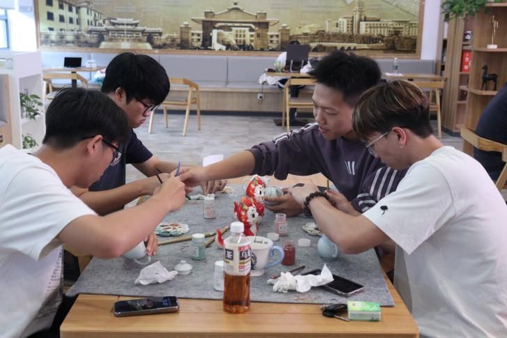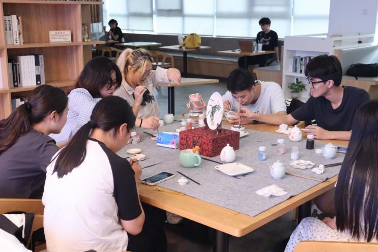 参观结束后,老师和同学们在工作人员们的引导下开始在白瓷茶壶上进行釉上彩自由创作。
