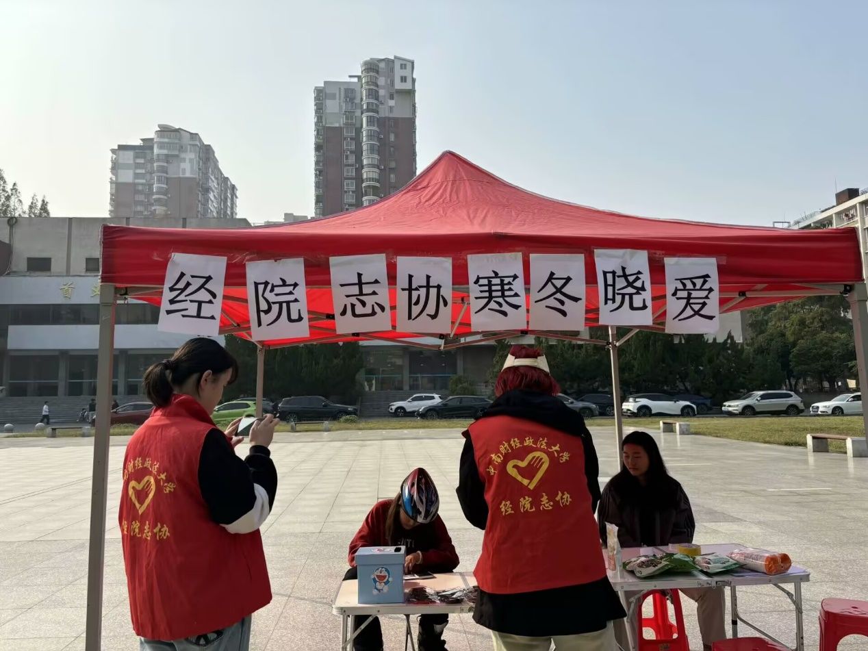 (通讯员:杨清堤)在校园日常生活中,教职工们扮演着举足轻重的角色,他们不仅是“甘为孺子育英才,克勤尽力细心裁”的谆谆教诲者,也是“点滴关怀撒温柔,微笑陪伴渡风雨”的贴心关怀者。随着冬日寒风渐起,温度骤降,为了在严冬中为教职工与同学们驱散寒意、传递温暖,半岛线上平台志愿者协会(以下简称“经院志协”)于2024年11月2日在中南财经政法大学首义校区首义广场成功举办了本次寒冬晓爱活动,该活动于下午17:00圆满结束。