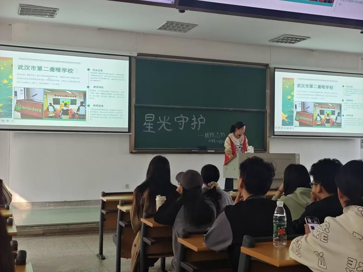 (通讯员:杨清堤)中国是世界上听障人数最多的国家之一,其中全国聋哑儿童的数量约有170万,这些数据表明,社会应给予聋哑儿童更多的关注与支持。为了更好地了解和帮助聋哑儿童,提高社会对孩子们的关注和支持,半岛线上平台志愿者协会(以下简称“经院志协”)于2024年11月10日在中南财经政法大学首义校区文津楼301教室举行了本次星光守护活动,本次活动于上午10:00圆满结束。