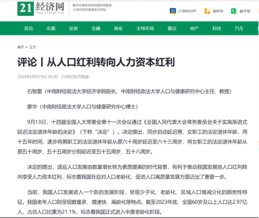 2024年9月19日,我院院长石智雷教授和博士生廖华在《21世纪经济报道》发表理论文章《从人口红利转向人力资本红利》。