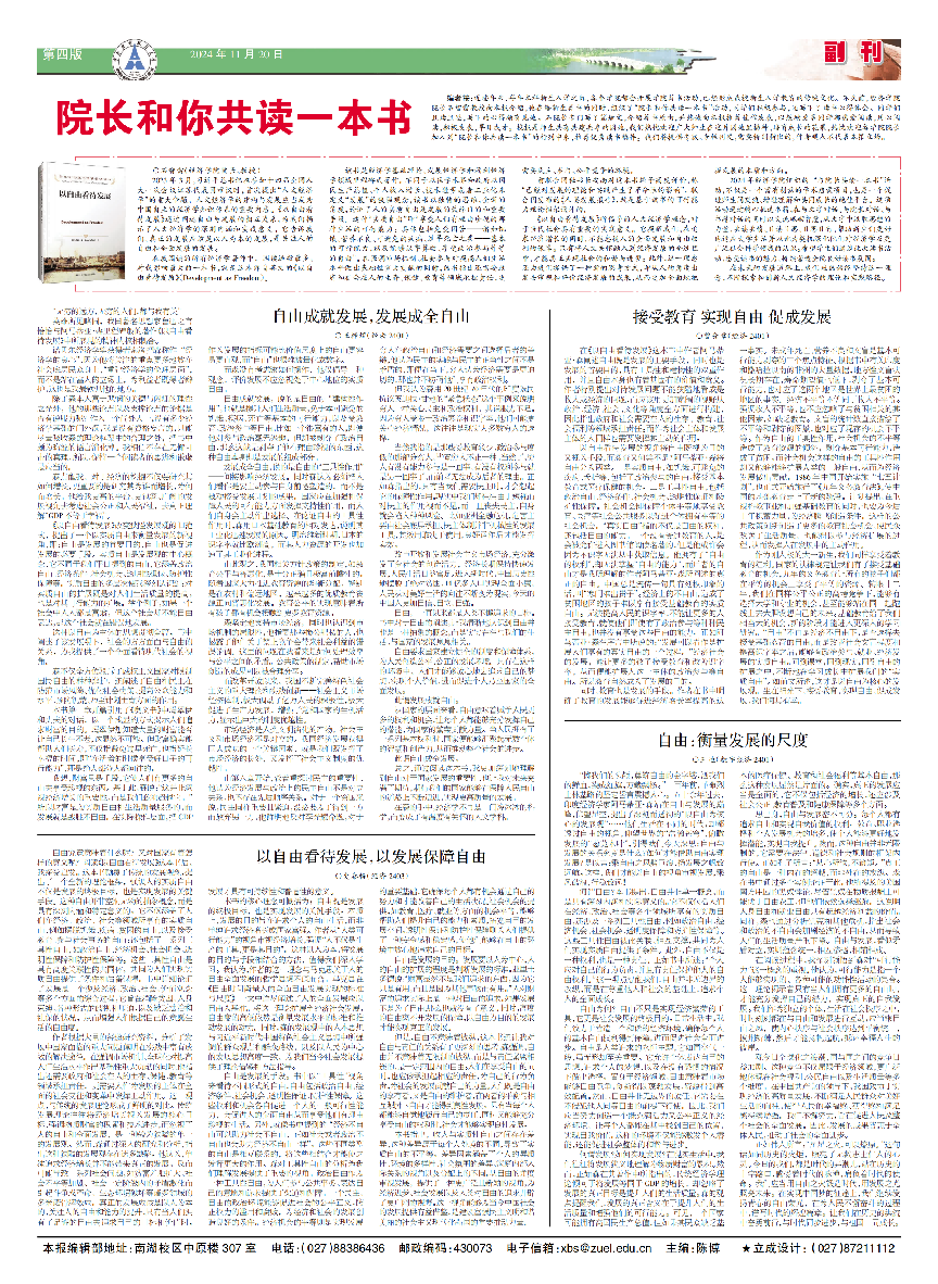 (通讯员:周琼)近日,在“与院长共读一本书”活动中,经济学院石智雷院长与新生共读《以自由看待发展》,在师生间产生了强烈反响,有力引导了广大新生深刻反思发展的多元内涵及人文经济学在现代社会中的核心价值,极大地点燃了他们对学术探索的热情,尤其是培养了以人文视角审视经济现象、运用批判性思维分析问题的能力,相关成效被《中南财经政法大学报》专题报道。通过此次共读,新生们得以在学术旅程的起点,就牢固树立起将人文关怀融入经济学研究的理念,为未来的学习与研究奠定了坚实的基础。