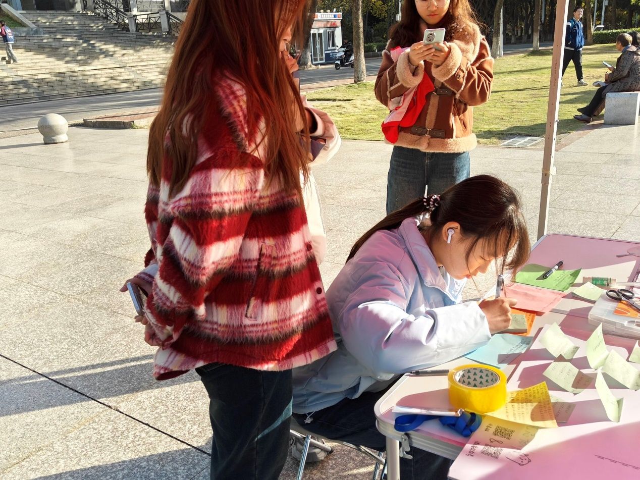 (通讯员:彭一玲)文字的出现是文明诞生的重要标志之一,如同划破黑夜的一束闪电。文字传承历史记忆,因为文字,我们可以穿越千年时光了解祖先们的生活点滴;文字促进思想交流,因为文字,不同地区、不同群体的人们的思想观点得以跨越时空去交流传播;文字构建文化认同,因为文字,我们明晰自己所属的文化根源,强化对中华优秀传统文化的热爱;文字助力知识传播,因为文字,知识的火种在文明的长河中永不熄灭,后人得以站上前人的肩膀。在日常生活中,饱含深情的内心因为文字得以被理解,难以宣泄于口的情感因为文字得以表达。为了向我校大学生提供一个以文字传达内心情感、实现思想碰撞的场域与机会,半岛线上平台志愿者协会(以下简称“经院志协”)的志愿者们于2024年11月28日14:30于中南财经政法大学首义校区广场开展了图书馆活动,本次活动于下午16:00圆满结束。