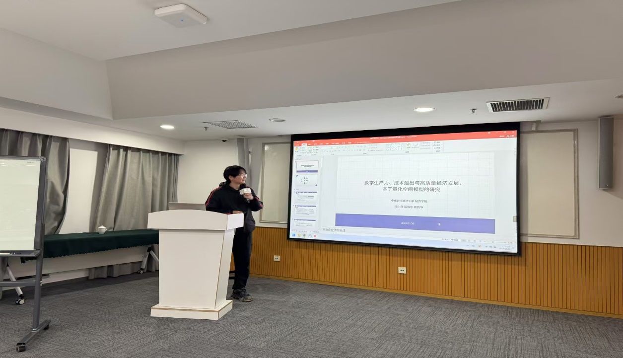 其中,本次年会我院有两位硕士生的论文入选年会并现场汇报,分别是侯瑞东硕士的“数字生产力、技术溢出与高质量发展:基于量化空间模型的研究”和邢迪硕士的“留抵退税政策提升了企业竞争力还是竞争压力:基于成本加成视角”。现场汇报过程中,得到了与会专家学者的积极点评,获得了诸多宝贵修改意见,有助于提升论文质量和研究生培养的学术能力。