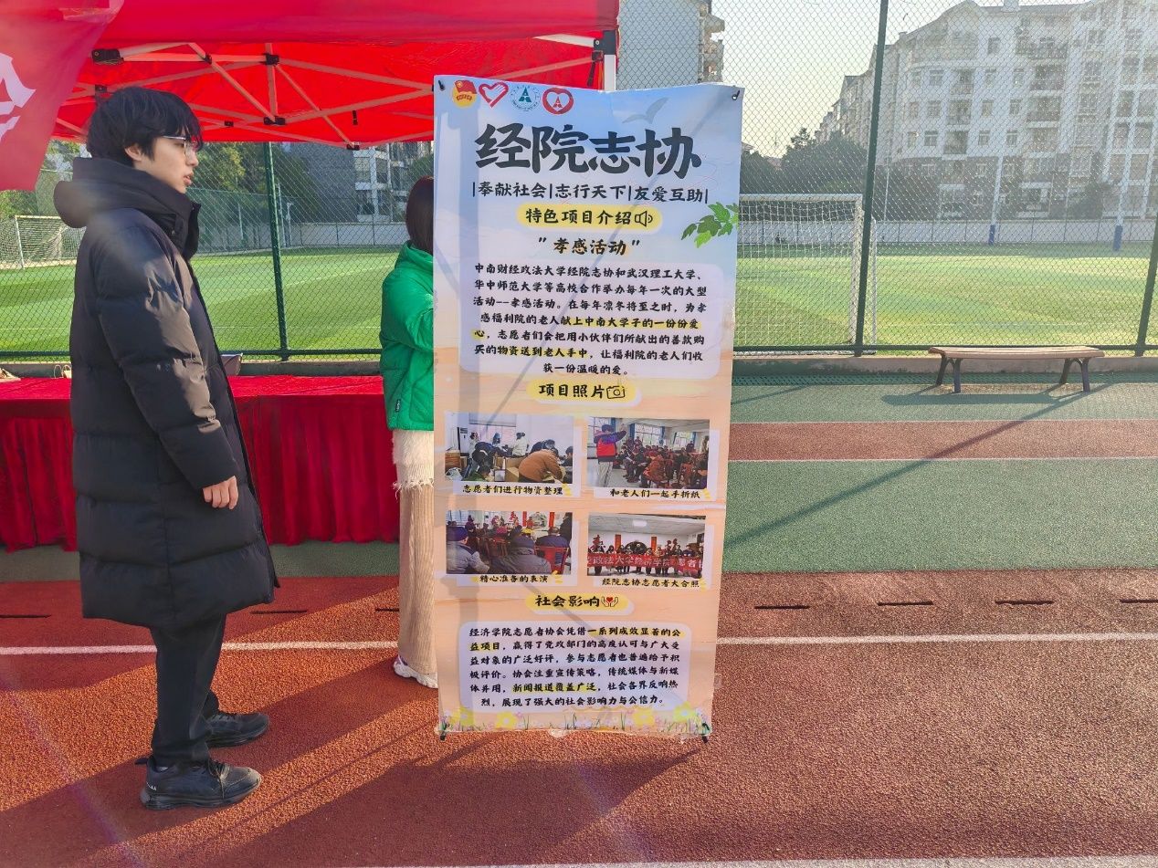 (通讯员:胡思宇)在第39个“12·5”国际志愿者日到来之际,为了弘扬志愿精神,培养高校学子奉献品格,使其更好地服务人民、服务社会,中南财经政法大学志愿者协会联合华中地区其他高校共同举办志愿嘉年华活动。活动在首义校区和南湖校区各举办一天——每日9:00-17:00。现场热闹非凡,校级志愿服务队及各个学院志愿者协会都积极筹备,同学们积极参与集章。其中,经济学院志愿者协会(以下简称“经院志协”)充分发挥学院特色,设置兼具趣味性与知识性的志愿游戏,举办暖心义卖活动,助力志愿嘉年华活动的成功举办。该活动已于12月1日17:00圆满结束。