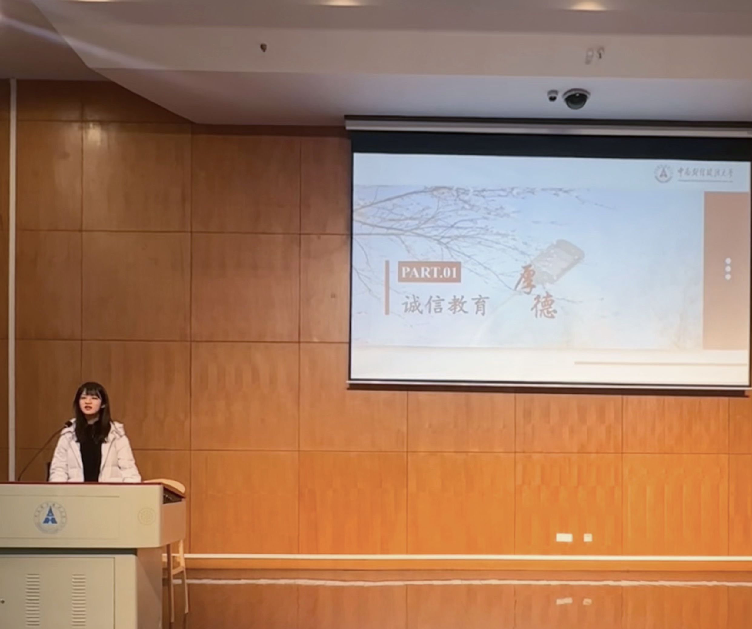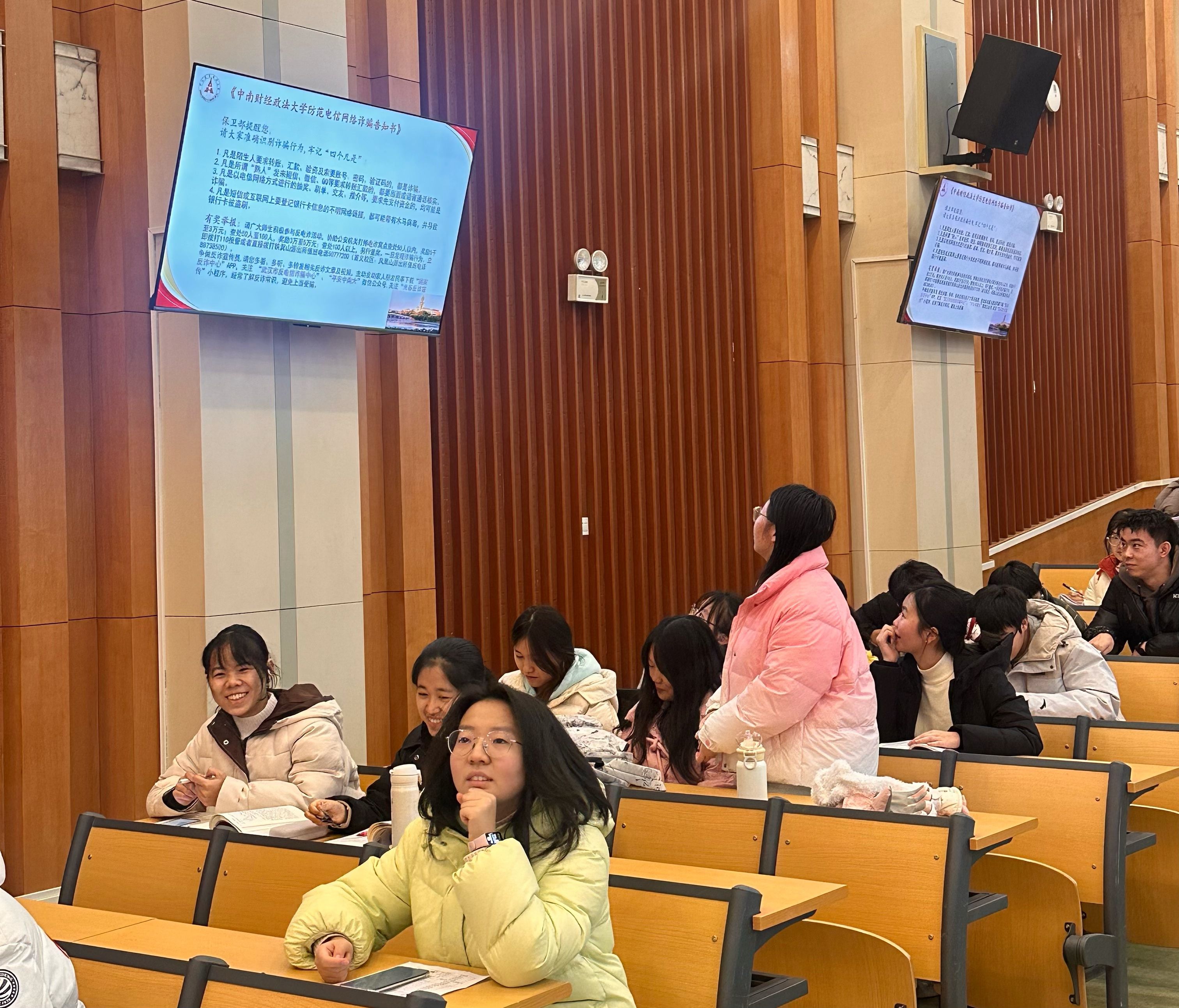 随后,包老师着重进行了诚信教育。她指出,诚信不仅是一种道德品质,更是每一位中南大学子应当坚守的原则和底线。为此,包老师详细解读了《中南财经政法大学全日制学生考试违纪舞弊处理办法》,让同学们更加清晰地认识到学校对考试纪律的严格要求。包老师明确要求同学们在即将到来的期末考试中,自觉遵守考试纪律,坚决抵制任何形式的作弊行为,用自己的真实水平去争取理想的成绩。同时,她还鼓励同学们相互监督,共同维护一个公平、公正、健康的考试环境。