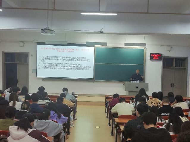 11月10日晚,马克思主义学院周术国副教授重点聚焦《习近平新时代中国特色社会主义思想的核心要义与精神实质》,讲述习近平新时代中国特色社会主义思想的意义、时代背景、核心要义、精神实质、科学内涵及实践要求,强调理论武装的重要价值,号召同学们在理论学习上悟真理、在具体实践中求实效。