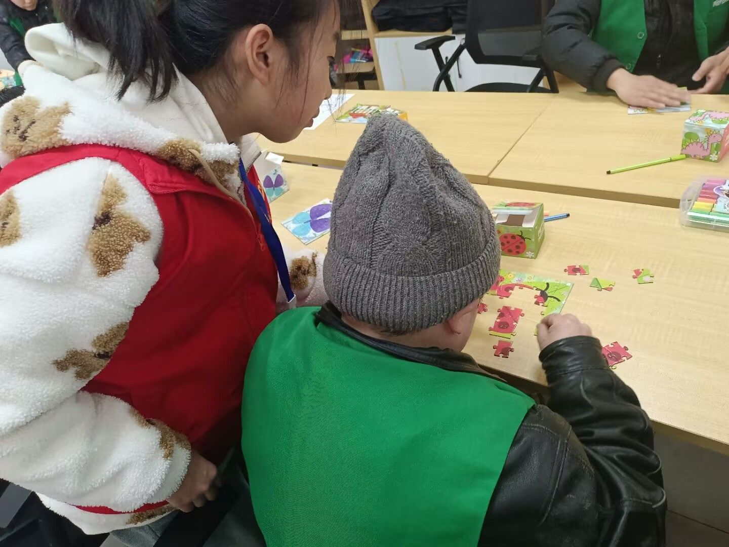 活动当日,志愿者们和阳光家园的负责人积极沟通交流,高效且有序地推动活动进程,并带领“大朋友们”进行了丰富多样、富有趣味的小游戏。在“大家来找茬”环节中,志愿者们积极教学示范,鼓励“大朋友们”勇敢尝试,积极实践;面对稍有难度的七彩拼图,志愿者们和“大朋友们”共同合作,认真细心地完成了拼图任务,锻炼了“大朋友们”的动手能力;在最后的图画上色环节中,“大朋友们”充分应用天马行空的想象力,以别具一格的视角认识事物,使空白画卷变得五彩缤纷、趣味盎然。活动尾声,志愿者们和“大朋友们”合唱《隐形的翅膀》,在动人的旋律中,为此次志愿之行画上了圆满的句号。