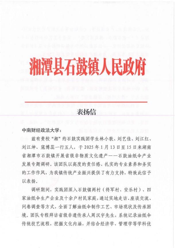 线下宣传亦是有声有色。多支队伍与当地媒体建立深度合作,登上地方报纸的专题报道,极大地提升了学校、学院在地方的知名度与美誉度。湘潭县石鼓镇政府部门还对林小敦同学带领的队伍致以表扬信,对其在社会实践中展现出的高度责任感、专业精神以及为地方发展做出的积极贡献给予了充分肯定。表扬信中提到,该团队的实践成果对推动当地相关领域的发展具有重要的参考价值,彰显了当代大学生服务社会的使命担当,希望加深与我校合作,共谱乡村振兴新篇章。