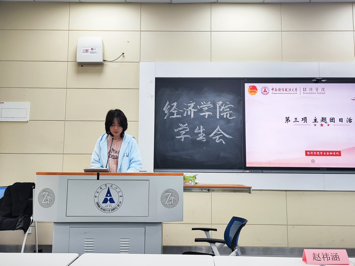 大会第二项议程由经济学院学生会秘书处学员江思维同学做主题为“学两会精神,担时代使命”的团日活动分享。江同学紧密围绕二十大的核心内容,结合经济学院功能型团支部的日常工作实际,从如何更好地组织开展团学活动、加强与同学们的沟通交流等多个角度,进行了深入且全面的解读分享。