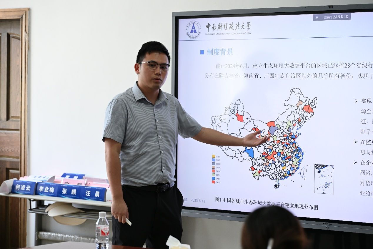 接着,中南财经政法大学陈语副教授以《通往数字生态文明之路:大数据环境监管与企业绿色治理》为题作了报告。基于“一企一档”的制度背景,陈语副教授首先从研究视角新颖、数据富有特色、政策见解独到等方面阐述了文章的研究贡献,接着系统介绍了文章的理论模型、微观样本、基准回归模型、工具变量选取。研究发现:大数据环境监管显著提升了企业绿色治理绩效,且这一结论在经由一系列稳健性检验后依然成立。随后,陈语副教授就机制检验以及异质性分析进行了系统介绍。在交流环节,与会师生就生态环境大数据平台的界定、企业进入平台的潜在激励、类似平台的存在性、平台对污染指标的选取与测度、企业异地生产等问题展开了讨论。
