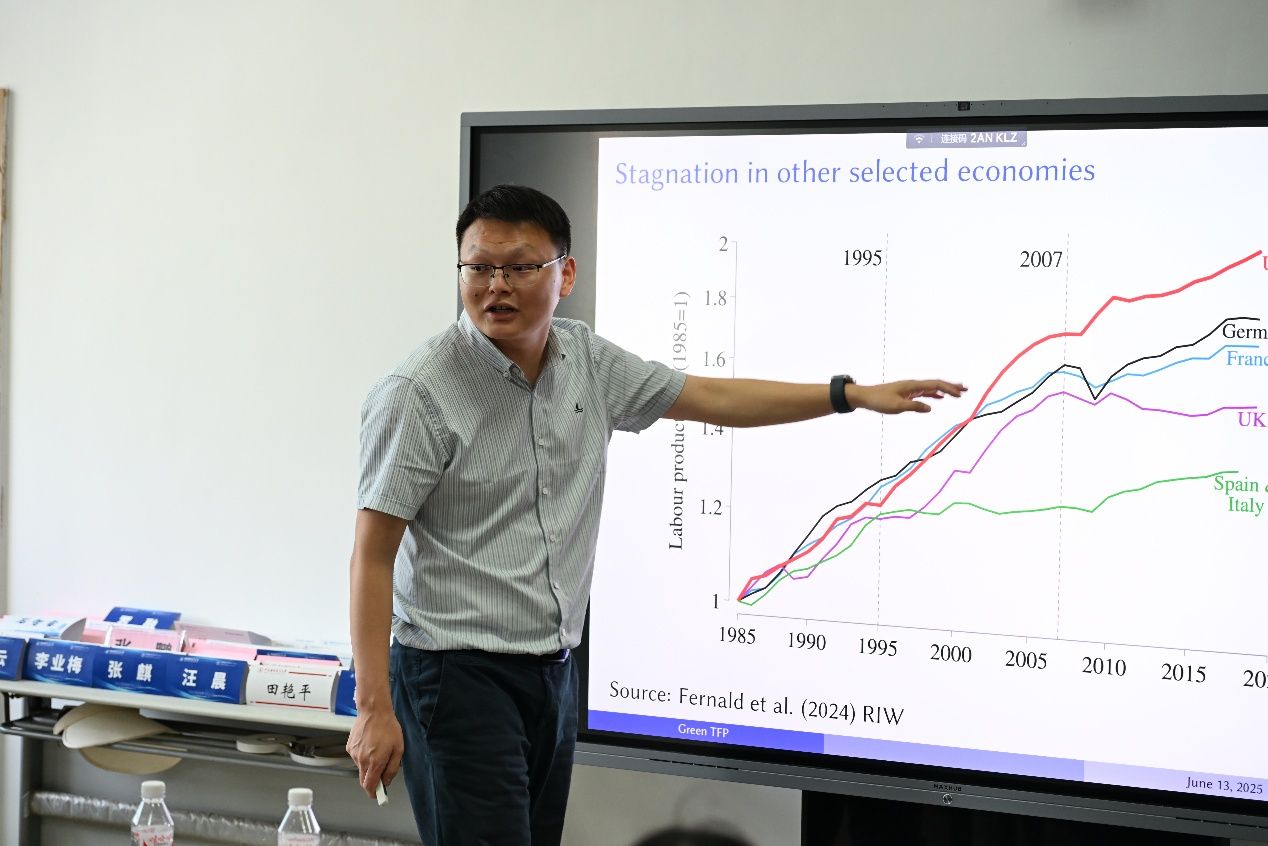 最后,中南财经政法大学戴胜副教授分享了题为《Can omitted carbon abatement explain productivity stagnation?》的报告。戴胜副教授重新构建了考虑碳减排成本的Fisher指数,并使用1990-2019年38个OECD国家的投入与产出数据,对绿色全要素生产率进行再测算,并进行了稳健性检验。研究结果表明,在考虑碳减排成本后,绿色全要素生产率出现了显著增长,而传统的全要素生产则停滞不前,这意味着忽视碳减排成本将低估全要素生产率增速。最后,戴胜副教授指出,基于净零排放目标,未来十年需要进一步的投资和创新。在交流环节,与会师生针对修正后的绿色全要素生产率指数的经济含义、碳减排成本的测度及模型处理、两类全要素生产率指数的变化趋势等问题展开了热烈讨论。