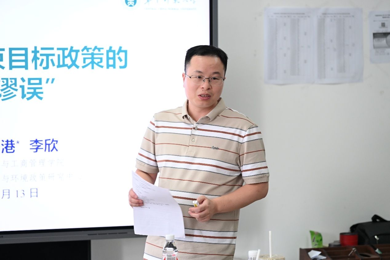 最后,华中师范大学谌仁俊教授分享了题为《节能降碳约束目标政策的“合成谬误”》的最新研究成果。谌仁俊教授首先引入“十二五”时期节能降碳目标的现实问题,指出节能降碳约束目标呈现东高西低的空间重叠与明显的平移特征,随后,使用LMDI指数分解法论证城市能源强度降低目标政策对减碳的贡献度,并使用2007-2015年全国税收调查数据进行经验识别;接着,从剔除其他并行政策的影响、替换被解释变量、稳定个体干预值假设三方面进行了稳健性检验,并从能源转型和节能技术视角,对节能降碳约束目标政策组合的有效性进行了拓展分。在交流环节,与会学者就具体样本数量、时间区间的划分、企业技术与能源结构选择、核心解释变量的方差等问题进行了细致讨论。